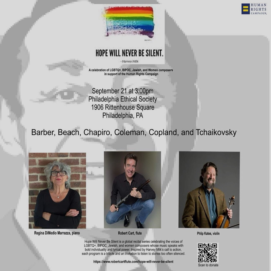 We will be performing Fania Chapiro’s Sonatine for flute and piano as part of Hope Will Never Be Silent, a global recital series celebrating the voices of LGBTQ+, BIPOC, Jewish, and women composers whose music speaks with bold individuality and lyrical power. Inspired by Harvey Milk’s call to action, each program is a tribute and an invitation to listen to stories too often silenced.